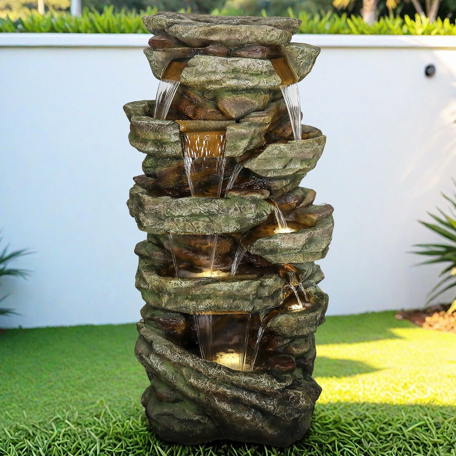- Naturalistic Multi-Tiered Rock Design: The fountain is constructed from a blend of high-density resins and natural stone aggregates, expertly finished to replicate the texture, color, and weight of real weathered rock. The multi-tiered cascading design creates a dynamic visual journey for the water, flowing gracefully from one level to the next.